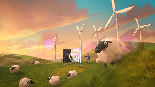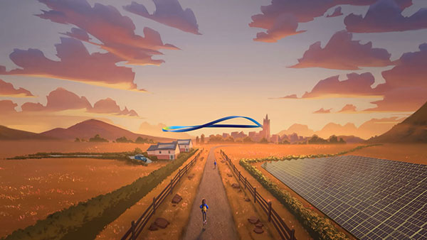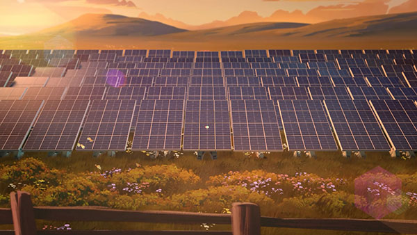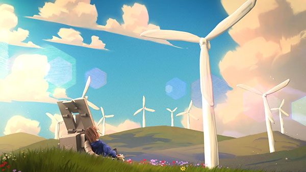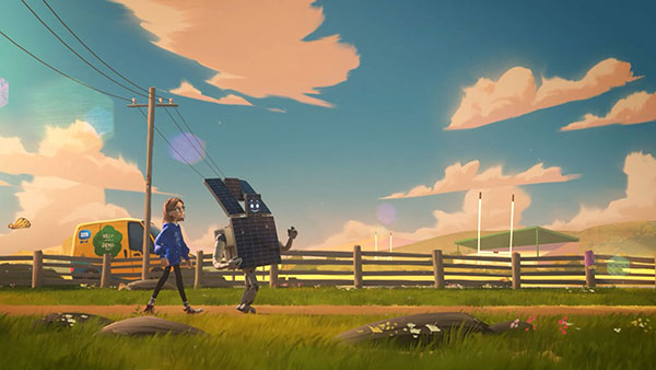 The majority of the studio’s passion for crafted 3D characters was poured into the creation of Grace & Sol. Grace’s inner turmoil and concern for the planet, her fateful encounter with ESB’s solar-panel personification Sol, and their epic journey of discovery required rich and deeply nuanced character development. Grace’s subtle expressions called for a refined, highly detailed approach that still complemented her looser, more impressionistic hair and wardrobe. Sol’s youthful charm was carefully balanced with his future-focused look and solar-robotic nature.